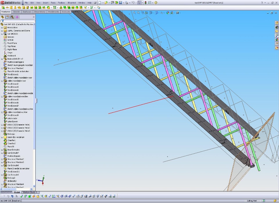 I'm experiencing a weird and annoying problem with a weldment part. Out of the blue my model started "bouncing" while zooming and rotating. Resulting in a flickering view. Selecting a sketch line is impossible this way, only faces can be selected. The sketches are displayed wrong as well. Check the attachement, the line used to connect to the dots...It used to be fine but somehow something has changed the part. I tried moving the rollback bar, changing the image quality and opening it on an other system but that didn't work out. The model is a bridge of 112.5m long and has radius of 145m. I'm working with Solidworks 2010 sp4.0.