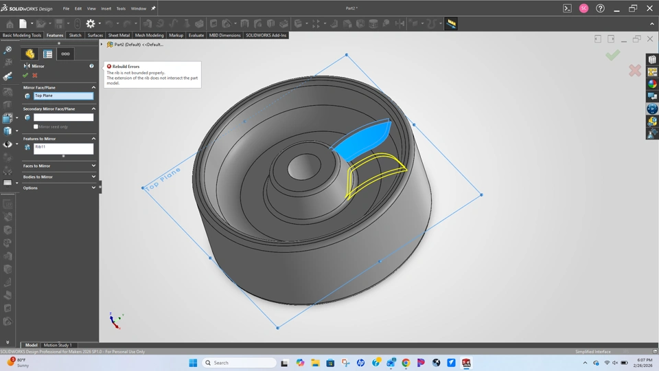 formed a rib and tried to mirror across plane but gives me a rebuild error of saying rib not bounded properly. The extension of the rib does not intersect the part model.