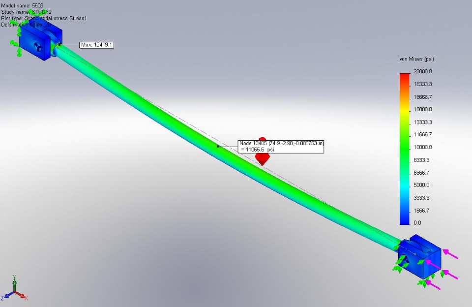In the rod simulation I fixed one clevis, applied a load of 127,235lbs to the other clevis, again gravity applied & pins able torotate in the clevis bores. I have attached JPG's of thesimulations, cyinder & 5.160" rod.