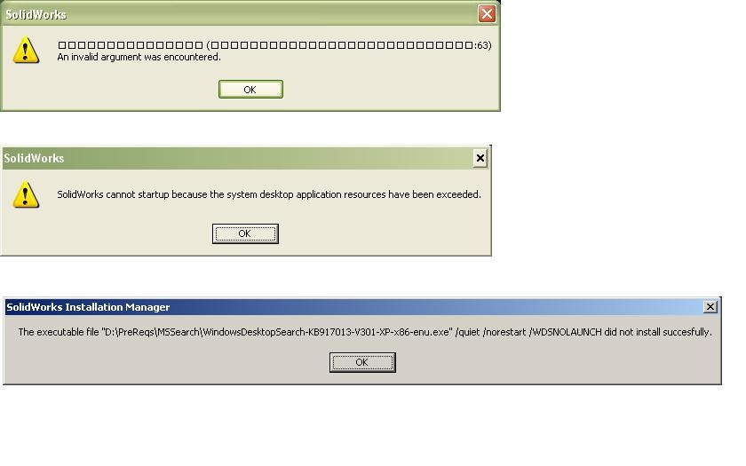 2nd is when the software is all installed and I try and bootSolidworks. I get the splash screen then this error. "InvalidArgument was encountered"