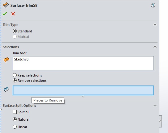 I tried to edit the surface-Trim58 but the pieces to remove box is grey out and I can't select anything?