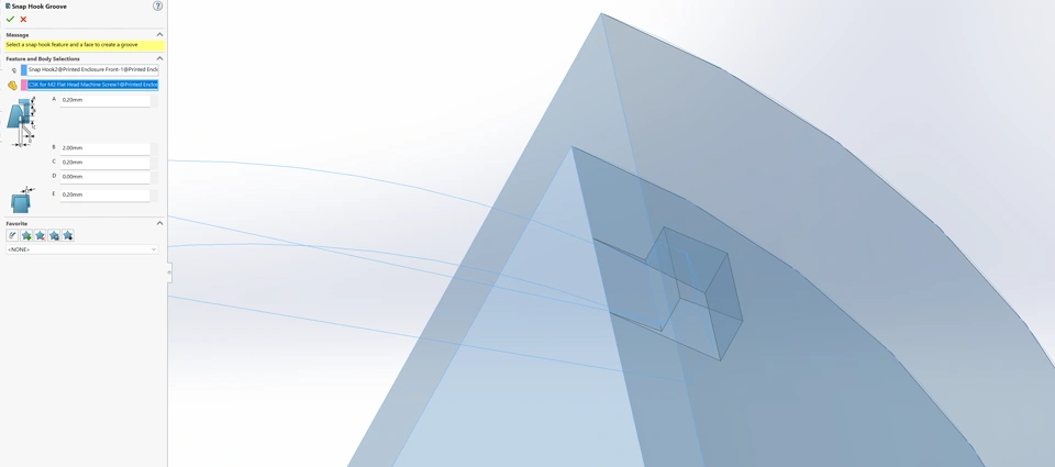 I am creating a snap hook setup on two halfs on a cylindrical object... I can create the snap hook just fine, however when I go to add the groove on the other half it shows me a correct preview but the states that the hook does not intersect the part when trying to rebuild. I have played around with the values with no luck, any suggestions?