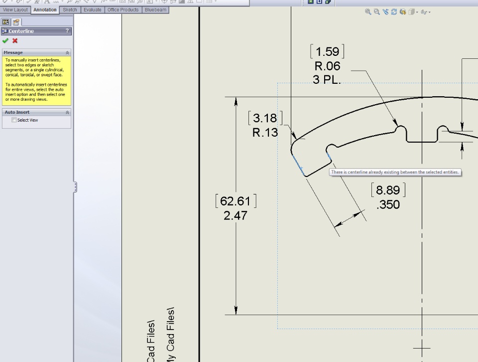 In my drawing I used the centerline command to add a centerline between to parallel lines (the sides of a feature). I added an angular dimension from another centerline to this centerline. It is rotated 30deg. I then realized I wanted to change the scale of my view so I changed it to 1:1 and added a break to allow the view to fit on my A size sheet. The dimension to my centerline moved on the sheet to the left. I deleted the dim., refreshed the drawing and the centerline disappeared. I assumed the centerline must have been deleted with the dimension. Not the case. I then tried to insert a new centerline but SW tells me "there is centerline already existing between these entities". If I hover to the right of the feature, I can see an orange dot that I believe is indicating the endpoint of the mystery centerline. I cannot select it.