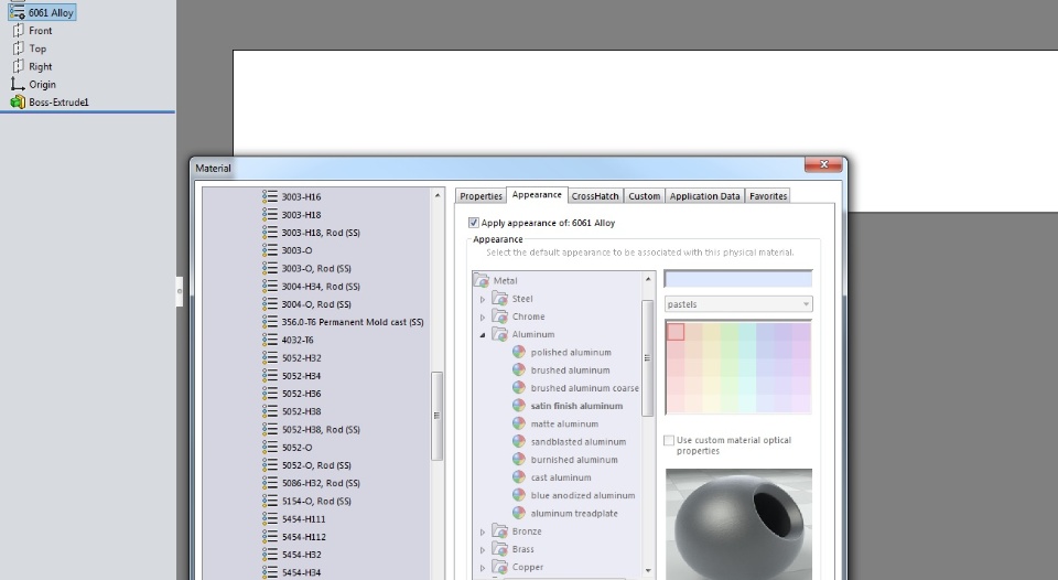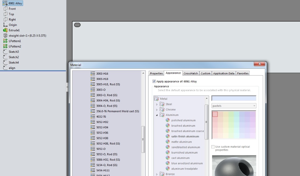 Attached are two screenshot pics. "6061-alloy-old" is from a panel in my design library that I created at least 5 or 6 years ago. "6061-alloy-recent" was drawn today and is obviously lighter. If I take an old model from my design library and change it to something else then back to 6061 Alloy, it shows the "recent" appearance. It's not a problem until I need to create a paper drawing for someone which happens occasionally. With the "recent" appearance, the shaded view looks like a wire frame view in the print and it is difficult to look at. The "old" appearance is much better for this purpose. I've tried custom appearances, but nothing seems to work nearly as well as the old 6061 Alloy. Does anyone know how I can get the old appearance back for parts that I draw now? Thanks for any replies.