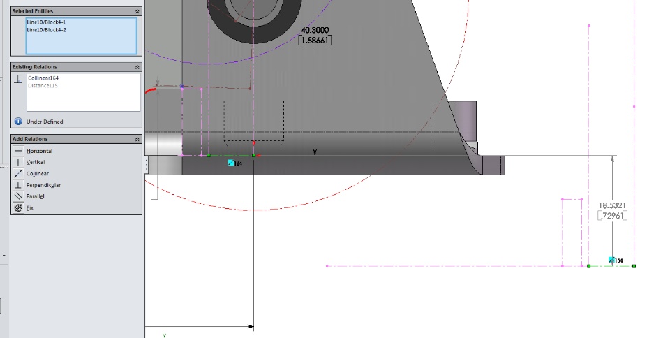 In 2014 SP 3.0 I observed the following behavior while trying to align two sketch blocks by applying a collinear relationship to the highlighted horizontal lines pictured below. There is an unexpected ≈18.5 gap between the lines. Has anyone else seen this before?