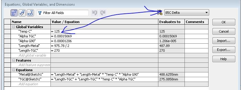 can one control the value of a global variable using configurations or a design table. i want a global variable to change its value depending on a configuration. referring to image below, the "125" should be "85" for the 85C delta config and for the 125C delta config it needs to be 125 and so on...