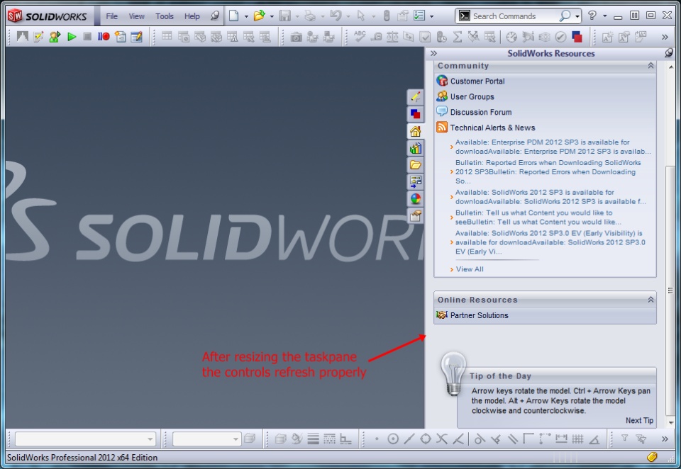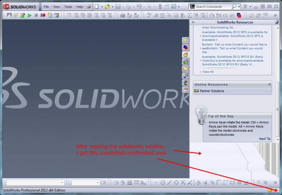 After resizing the main solidworks window, we can see that the task pane does not update properly....