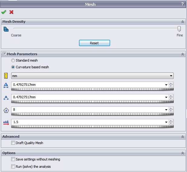 If the slider is at the rightmost end with curvature based mesh and the elements size shows for example 0.479….