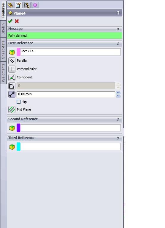 When using SW 2010 SP1.0, I am trying to insert a reference plane a certain distance from a reference face of my part, the same way that I have done for years. I select the face then click the reference plane button and then insert a distance. The property manager for a plane is slightly different, but works the same. The distance that the plane is offset cannot be change from .0625. Anybody else noticed this, or is it just me? Or am I now doing something a bit wrong?