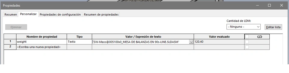 I'm trying to create a VBA macro in SolidWorks to automatically add a custom property called "weight" to my documents (parts and/or assemblies). This property should be linked to the SolidWorks mass property (SW-Mass) so that its value updates automatically.