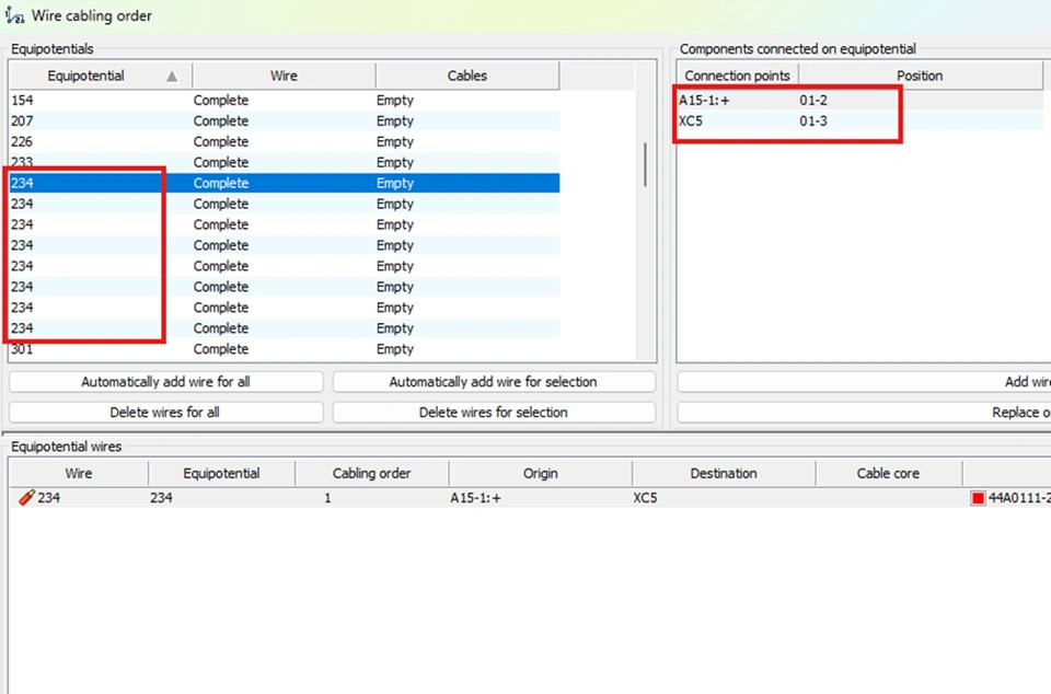 And because of that, I can't assign the wiring route the way I need. For example, A15-1:+ goes to XС5, but I need the wire to physically go to another component, even though it has the same equipotential. If I set different settings in the component itself:
