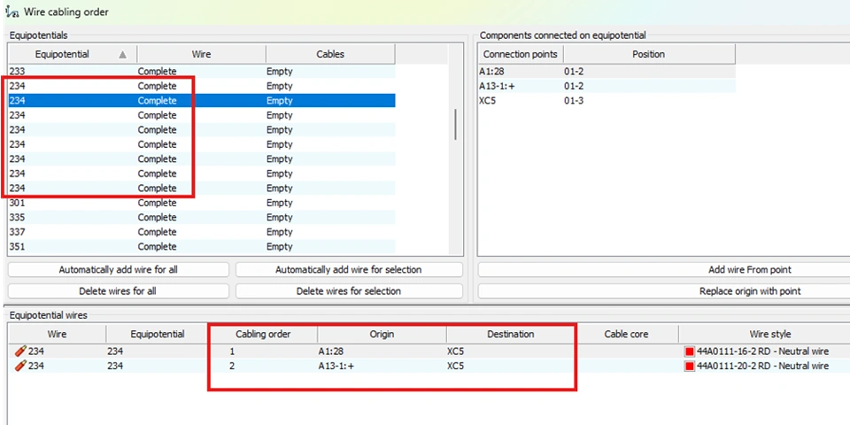 Then, in the Cabling Order, everything shows as a single circuit, but the connector (XС) itself is missing. So, I still can't physically route the wire where I need it to go. Physically, the wire A15-1:+ now goes to A13-1:+, not to the splice connector (XС)