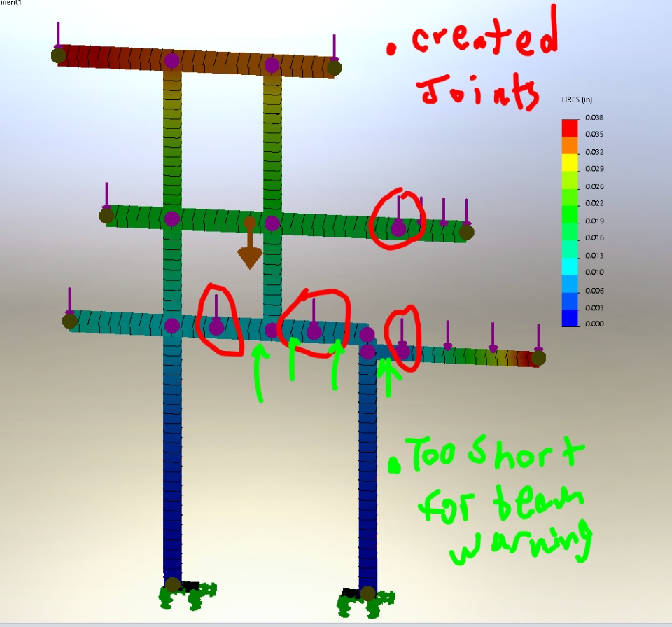 Have a pipe support structure that has various point and distributed loads on it. I had to manually add joints where loading occurred. see picture Basically breaking a weldment member sketch into multiple lines. How to do this can be found elsewhere. This enabled me to load beam element not just on ends of beam or distributed across entire beam, but at any place between ends. After doing this though, I get the warning that certain beam elements are too short. Just curious if this warning can be overlooked because I technically still have 1 long beam that is acceptable but broke it into a number of smaller beams so could point load.