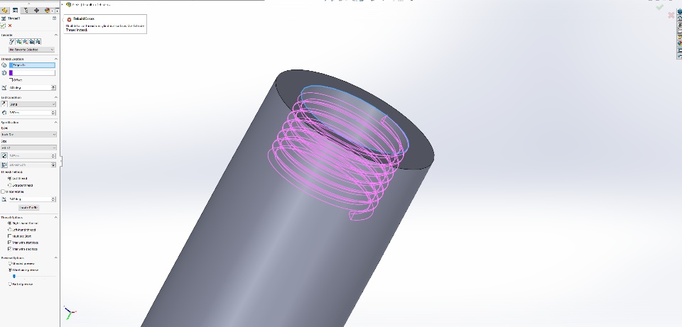 This is a fairly trivial thing to do, yet I cannot understand why Solidworks doesn't want to do this. It only wants to do an extruded thread. Also, the forum UI has changed significantly since the last time I visited, so I have no idea how to attach a part file within posts now. Whenever I tried uploading a "part file" or "document file", it gives me an error saying the file type is not supported.