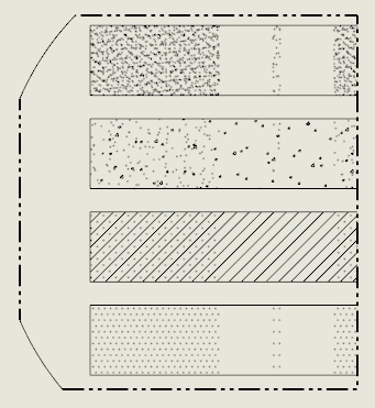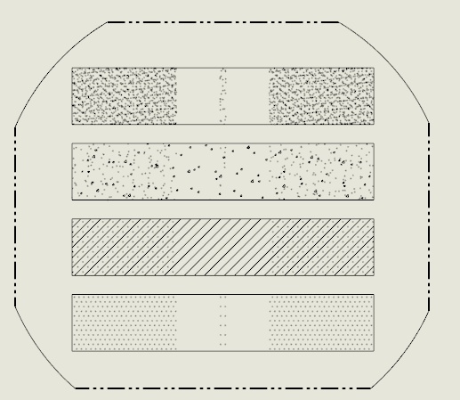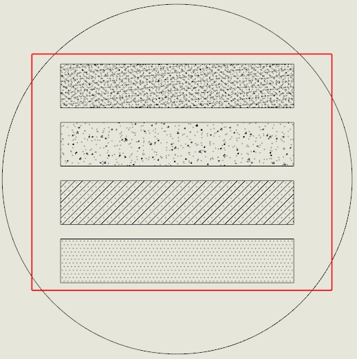 I found this when working on a drawing using SW2017 SP5. The problem can be easily duplicated. Below is an image of a drawing of a simple disk with four rectangular extruded cuts. The rectangular faces are hatched using the AEC Sand, AEC Stone, Concrete and Dots patterns respectively. The red rectangle is sketch geometry in the drawing view. Everything looks good: