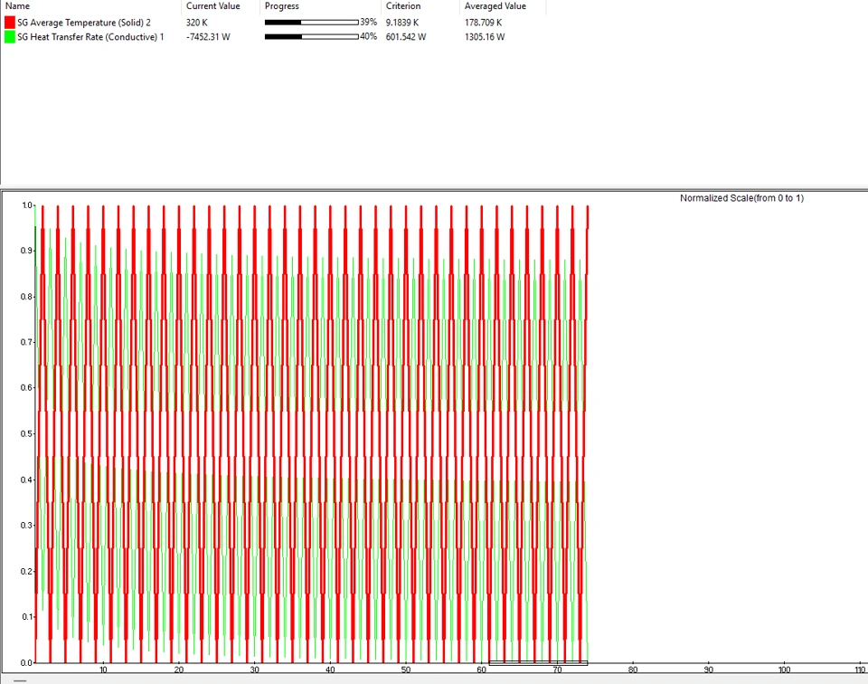 When I run the simulation, instead of observing a gradual temperature decrease at the cold tip over time, I see oscillations in both temperature and heat flow rate (screenshot attached). This doesn’t seem physically correct—I’d expect a smooth transient response.