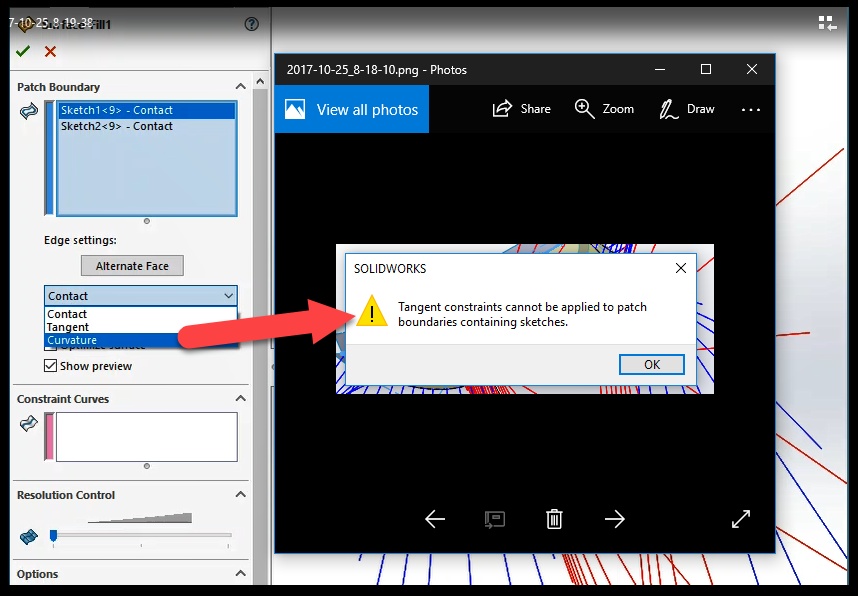 In the video (SWX 2012) curvature option is used to fill Surface. But in my case it is giving an error message. My one is SWX 2018. What is the reason?