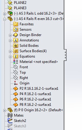I originally had these parts modeled as lofted shapes, but they were too messy and unstable (many curves were being modified during design), so I went to sheet metal instead.