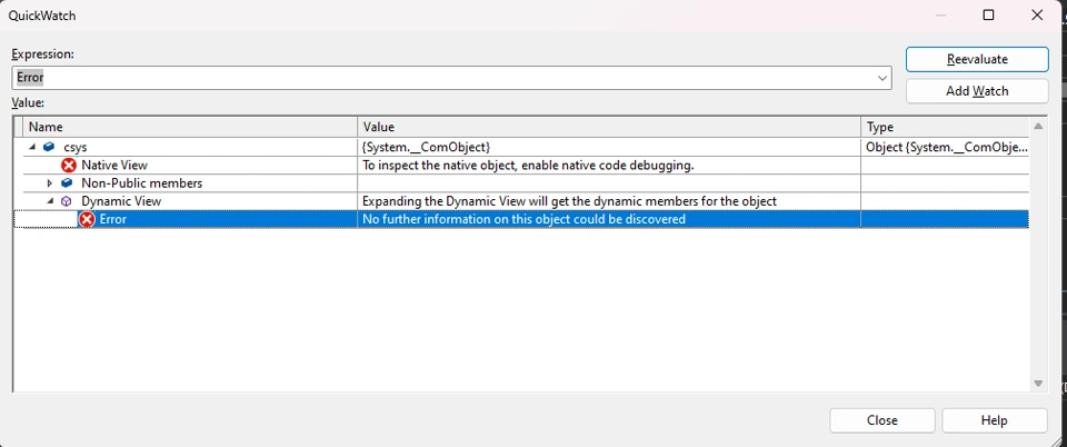 The if I view that "csys" in Quick Watch, It gives the error shown in below image and sometimes "To inspect the native object, enable native code debugging" error.