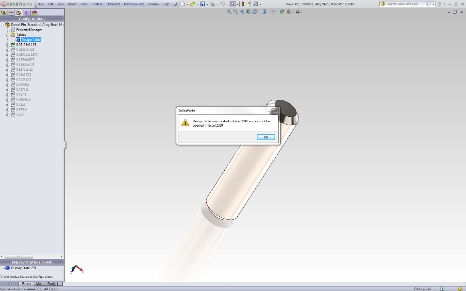 As the title states. This is what comes up when I try to edit the design table. Any suggestions? File is native to SW2011 and Excel 2010(created last friday).