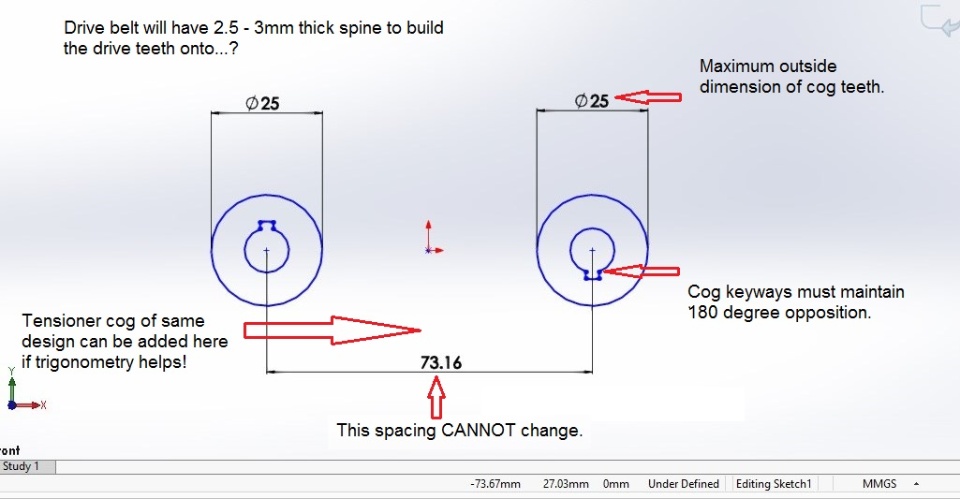 A third cog of equal design could be added as a tensioner if trigonometry makes this design any easier. If not, I was just going to design a basic adjustable tensioner pad later.