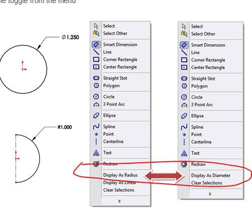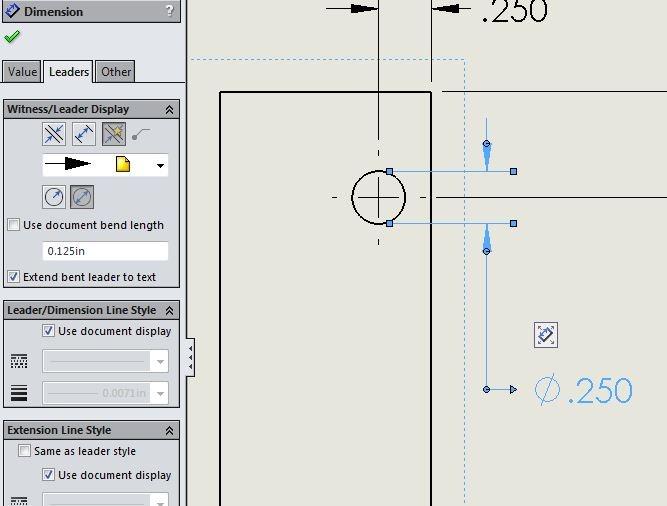 I have Solidworks 2015 and in the first attached photo is my drawing. As you can see the hole dimension is a .25 diameter. I put this on the drawing sheet by using the "model items". I cannot get this Linear dimension to a Diameter dimension with just 1 leader. I have tried to find a command (apparently Display as Diameter) and the internet says it exists, but not on my machine? Under the Witness/Leader Display there is no icon and I can't get a right click to show "Display as Diameter". I do get "Make Radial", but that is not what is needed here.