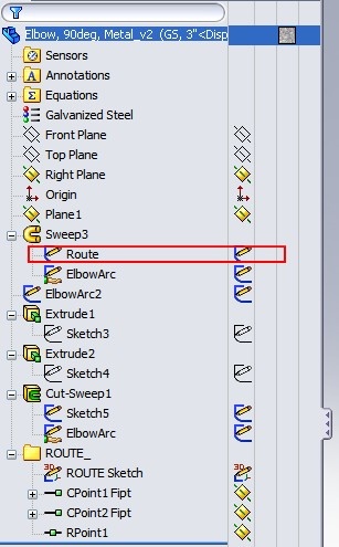 I went to change the route diameter, and unfortunately the radius stayed the same while the rest of the parts changed from 2" to 4", so of course, the 4" elbows didnt like the smaller radius, and now ive got pretty red elbows and error messages instead of 4" elbows. Upon returning to the main assembly, the elbows just simple arent there anymore because a valid configuration wasn't available.