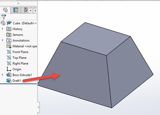 This model was obtained after using “Draft” tool. I want a vertical plane of the slope surface. Is it correct to move End Line of the Design Tree up and have the cube with a vertical faces to use?
