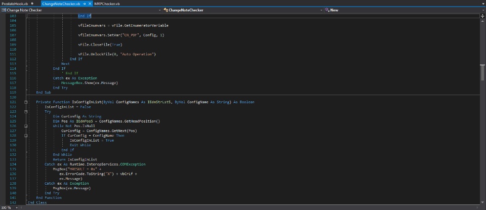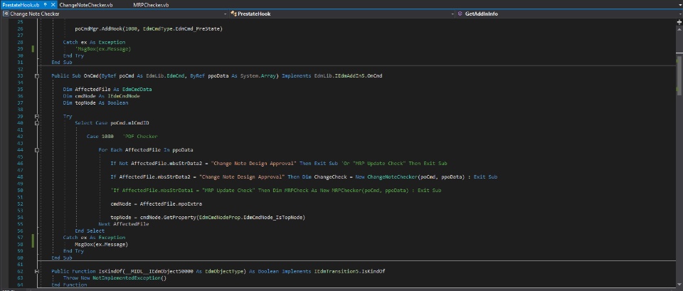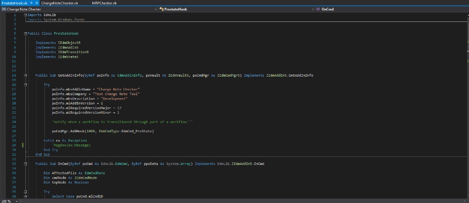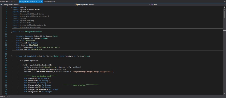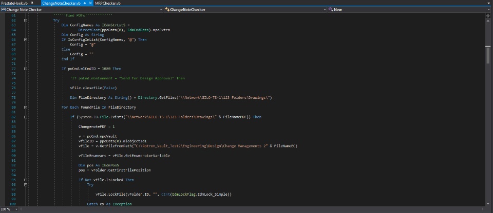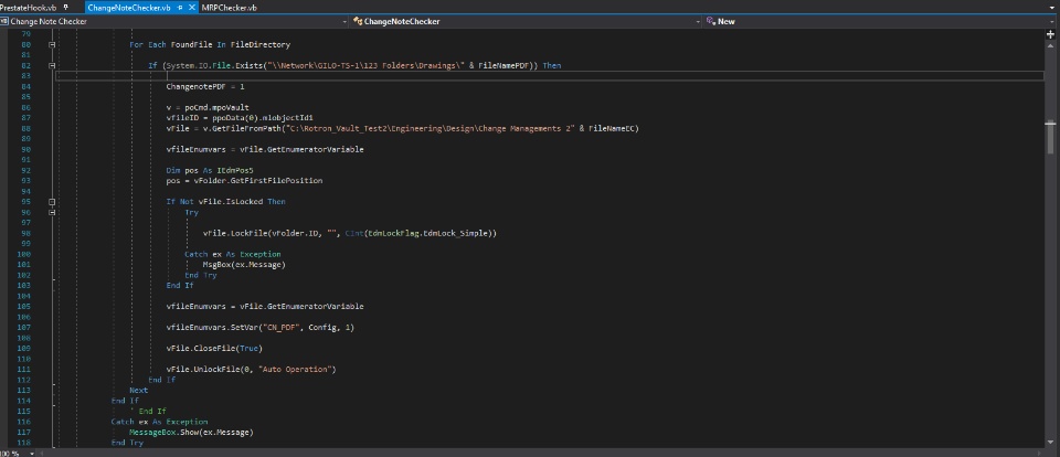 In the 'ChangeNoteChecker' class it should check for a location of files. In my code below it is a pdf file. When it verifies that one is there it should check out the data card file. update a checkbox variable and check it and then check the file back in and proceed with the transition.