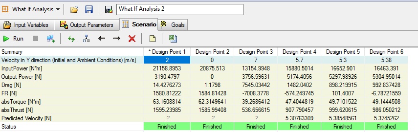 I am running an external flow flow simulation Goal Optimisation on a marine propeller. I have set a rotation speed for the propeller, and I am hoping to learn the steady state velocity of this (Initial Fluid Velocity is the input of the goal optimisation). As thrust is inversely proportional, thrust will eventually converge with drag. Hence my first idea was to do a goal optimisation to 0N of resultant force where Fr = Thrust - Drag (I have drag calculated in another Equation Goal). This was taking a very long time to converge, so I was calculating velocity based on the thrust (using another equation goal, derived from a drag curve), and inputting this manually in What If Analysis, and this was converging much faster. My question is this: Can you select a goal, or any other ouput, as the input for the next design point in a Goal Optimisation?