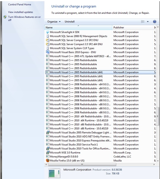 I have reviewed several posts as to suggestions on a fix. One of the documents states to remove Microsoft Visual C++ 205 and 2008. I am unsere as to what to uninstall. I have posted a pic of the programs showing up as being installed. Do I remove ALL 2005 and 2008 installs?