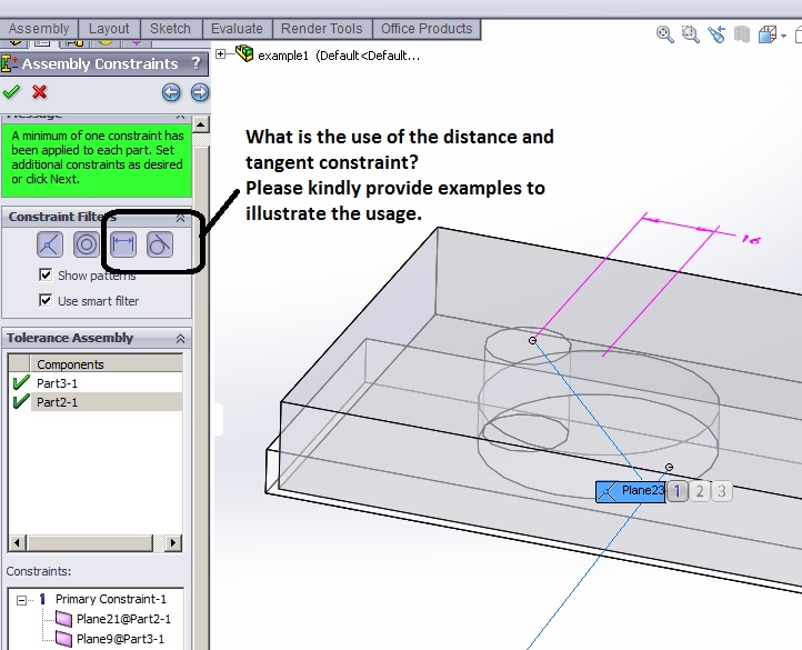 Do you have any examples to illustrate the usage of tangent and distance constrain in Tolanalyst? I could not find any examples in the SolidWorks online help and tutorial.