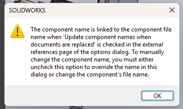 SOLIDWORKS Bill Of Materials I am trying to exclude a part from my bill of materials using the properties menu (r-click on component in feature tree, select properties). I have "update component names when a document is replaced" checked, because I want to see the name of the component I have in my assembly, not the name of the component I replaced three revisions ago. When I check "exclude from Bill of Materials" and hit ok, I get an error (see screenshot). Is there any workaround? Do I have to edit my system options every time I want to exclude a toolbox fastener or other part from the BOM? (Using SW 2023 SP5.0)