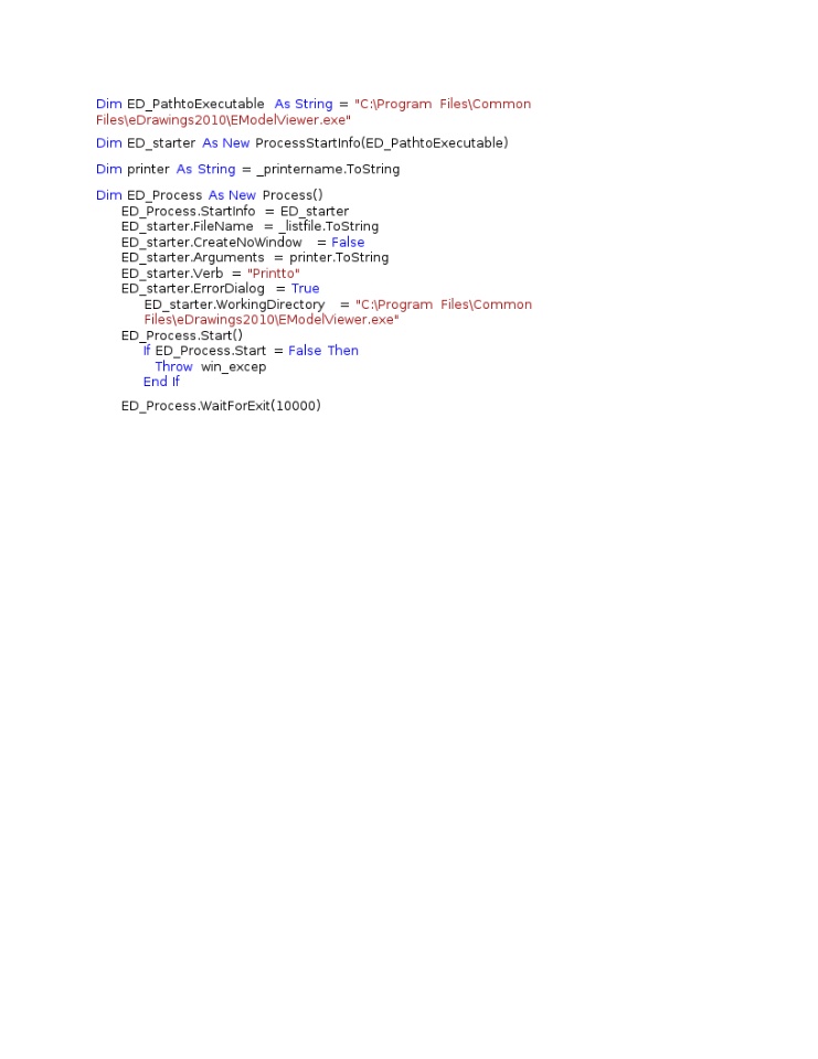 I imagine that there are some parameters I'm not setting right when I attempt to send the "print" command to the e-draw application considering that the application starts fine when I simply launch e-draw from the other process. I am running on XP SP3 platform with the 2010 version of e-draw installed.