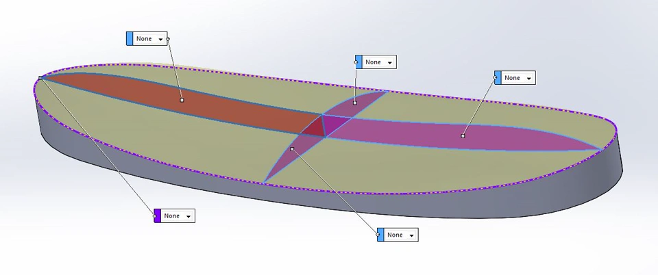 I have created a surface using two sketch profiles and a guide edge for the boundary boss function. I can wrap a text sketch and emboss off the surface. But, there is a weird "convergence point" in between the J and K (see pics) that will not allow the extrusion to complete. This also happens to be where the two sketch profiles converge (see pics). Not sure what is going on. Thanks in advance.