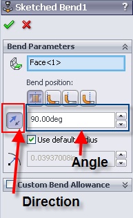 I am trying to create a sheet metal from a flat sheet and bending it accordingly using sketched Bend option, but when i create multiple sketches it always bending inside the sheet metal. Is there any way we can edit the angle of that bend?