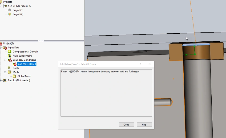 The error is stating the lid is not laying on fluid region. Just moved to SolidWorks 2025 SP5.0, earlier versions I would move boundary to match the lid plane. This trick is not working in this version. 1) Is anyone else seeing this problem? 2) Does anyone have any proposed ideas/ solutions?
