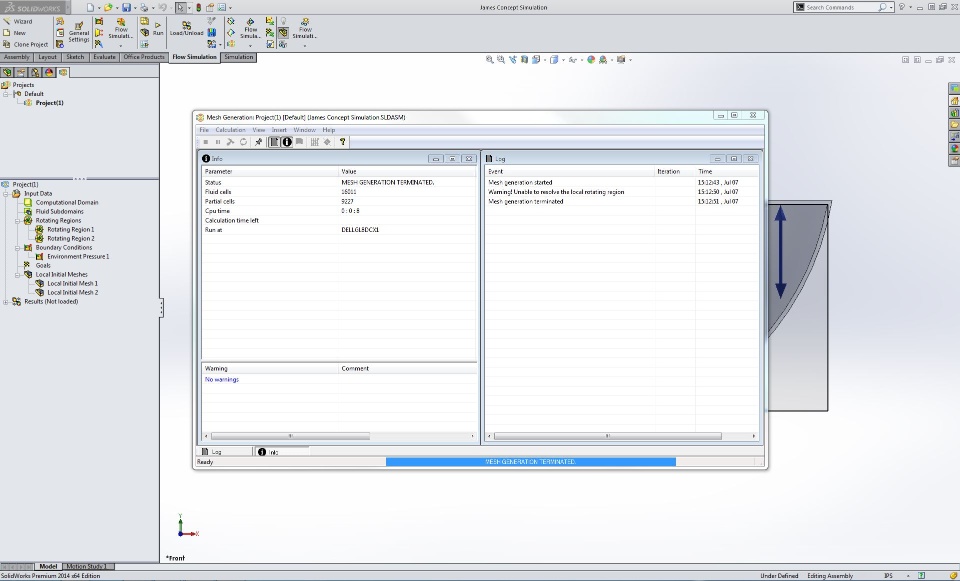 I am trying to run a flow simulation on hand mixer beaters in water. Every time I go to run the simulation I get a "MESH GENERATION TERMINATION" in the Info and Log screen. I am fairly new to the flow simulation so I am a bit lost as to what to do next. Attached is the file. Also a picture of the screen when the error occurs.