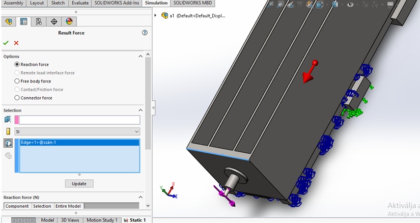 I try to get how much Newton is the force by assign the Edge <1>@szán, but i dont know it's ok, or not?, and witch option i choose Reaction force or Free body force?