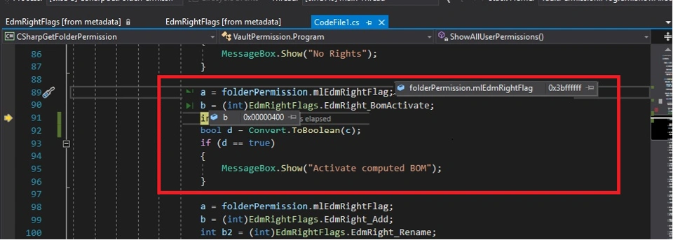 However, during debugging of our code, we observed that it indicates the permission is configured for "Active Computed BOM." Please note that the 11th bit indicates EdmRight_BomActivate is set for “folderPermission.mlEdmRightFlag” variable.