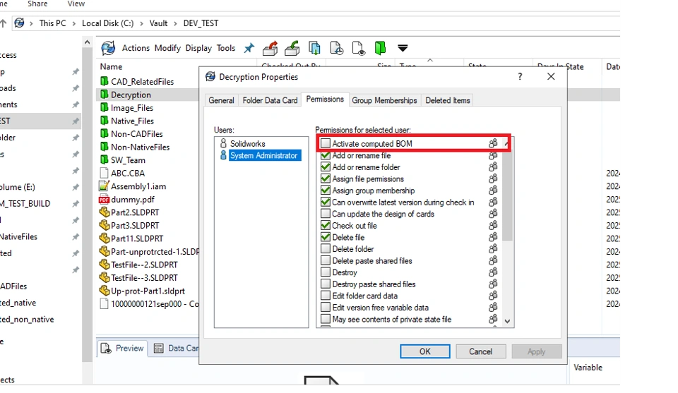 In SW PDM folder for the admin user, “Activate computed BOM” (highlighted in red colour box) is not configured or not set. It is the same for the other user “Solidworks” also.