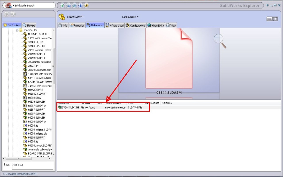 03500.sldprt has an In-Context Reference to 03544.sldasm as seen in SolidWorks explorer: