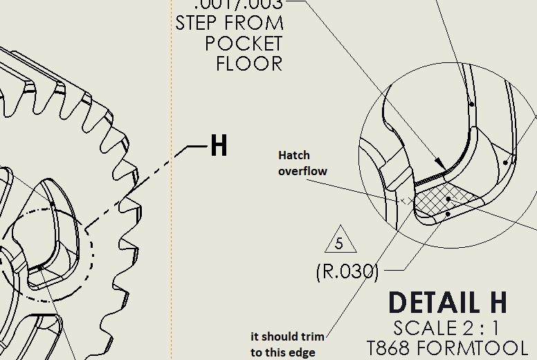 When hatching a face in a view, solidworks is not properly trimming the hatch.
