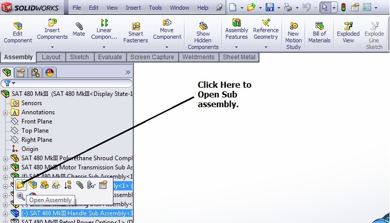 I often want to open a Sub assembly so intead of finding the top assembly in the tree i click a part I know to exisit in the assembly solidworks then select that part in the tree i then scroll up to see the sub assembly select it and click on open Assembly.