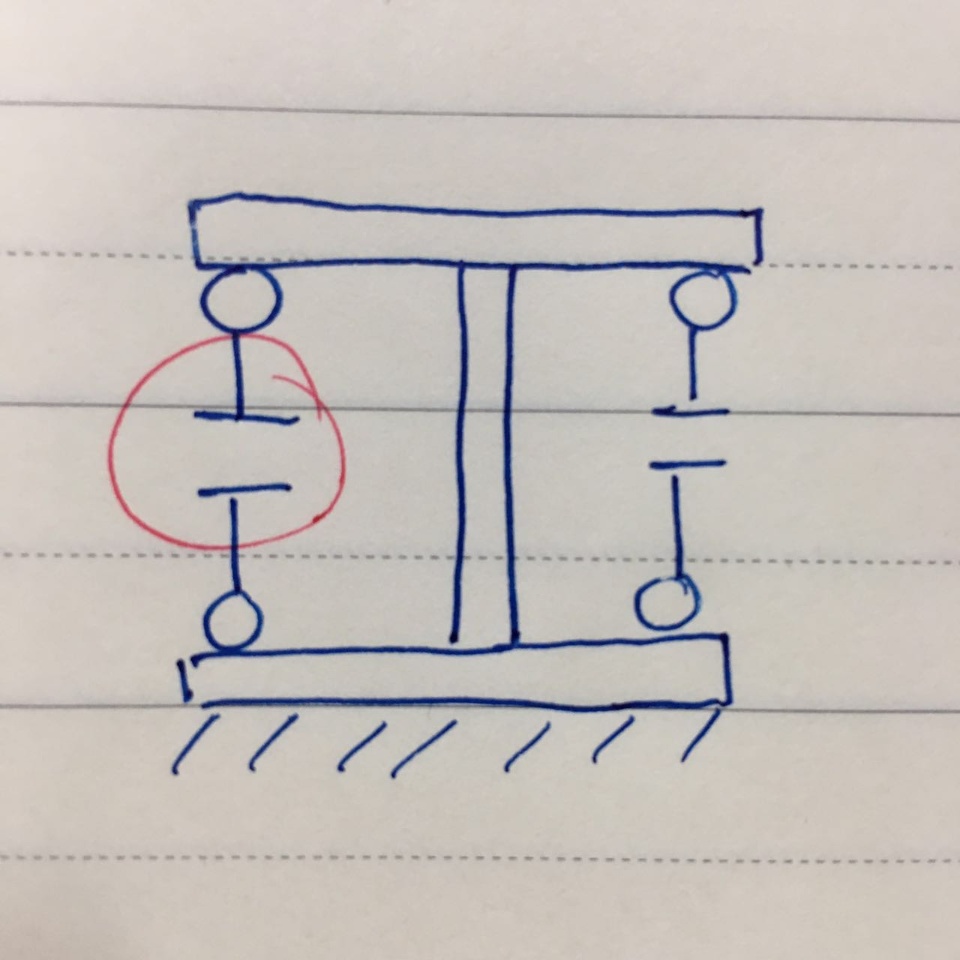 I have include a very simple schematic below (bad drawing) to simplify what I'm trying to explain and do here. So I have two parts with faces parallel to each other (in red), There are two plates (top/bottom) that the parts are connected to with the bottom in a fixed geometry. In the middle there is a flexible rod acting as a spine. The parts are connected to the two top and bottom plates via ball joints that can rotate freely.