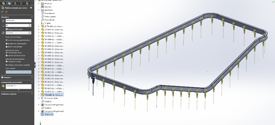 I need help with patterning a part. I want to pattern a trolley through a path, but I want it to behave like it would do in real life (the trolley always perpendicular to the beam segment and following the curvature). The problem is that when using the pattern feature I can only make it work with "Aligned with original feature" however that does not represent the correct behavior.