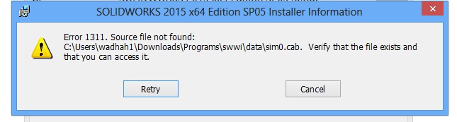 can any one help me when install soildwork this message appears error 1311source file not found (sim0.cad) verify that the file exists and that you can access it@