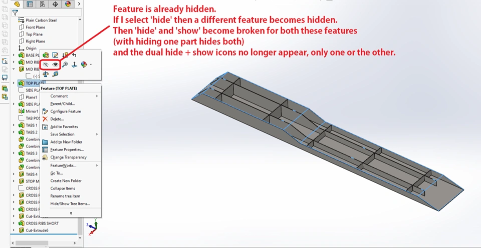 Out of curiosity I tried hiding the hidden feature and it ended up hiding a different unrelated feature (boss extrude, separate body).