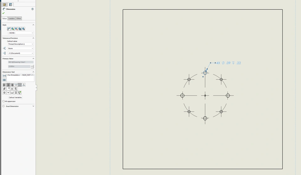 I made a hole with the hole wizard and am trying to show the thread description (Dimension Text shows ) but nothing is working. I made sure that my calloutformat.txt file is in the correct file and the file path for hole callouts is correct. I'm concerned it might be the calloutformat.txt file itself that is corrupted? I also tried repairing SolidWorks but nothing changed.