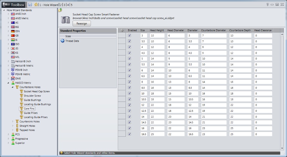 However, as I would like to add some under head countersink info to the counterbore I have discovered I am unable to add a new column to the hole wizard properties. Also I would like to remove some information and also remove some of the standard features that have been copied across, this cannot be removed either.